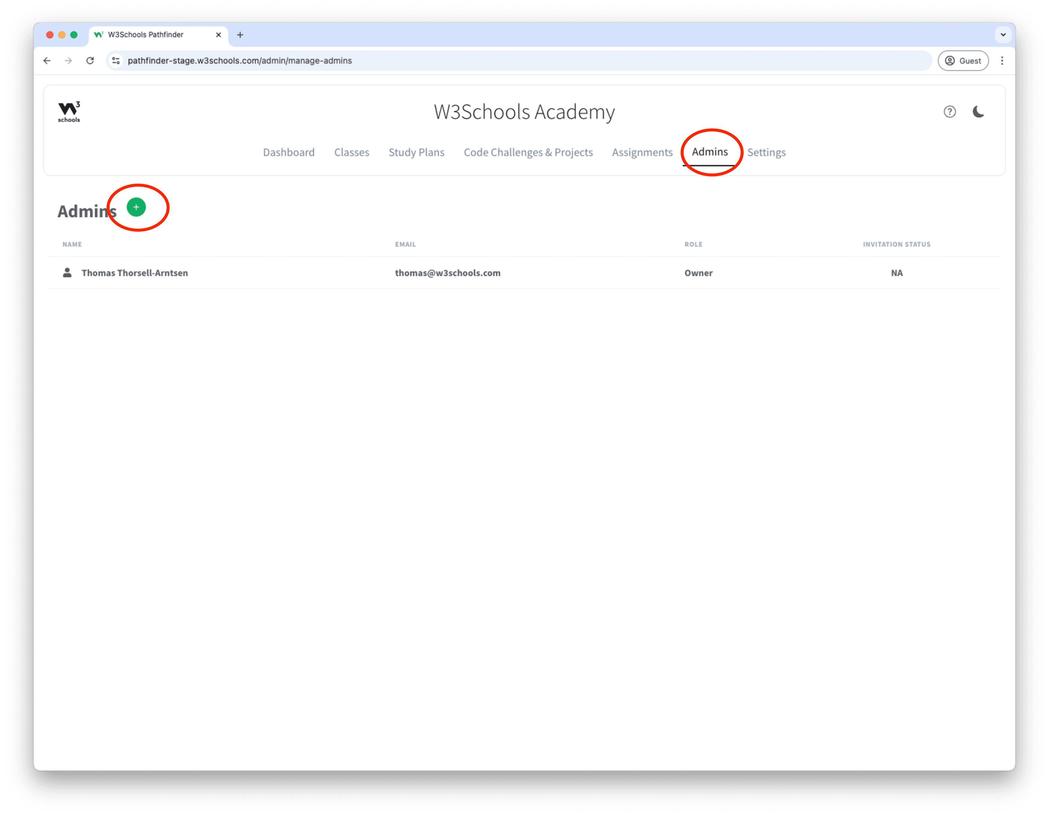 1. Click the "Admins" button in the top navigation menu.