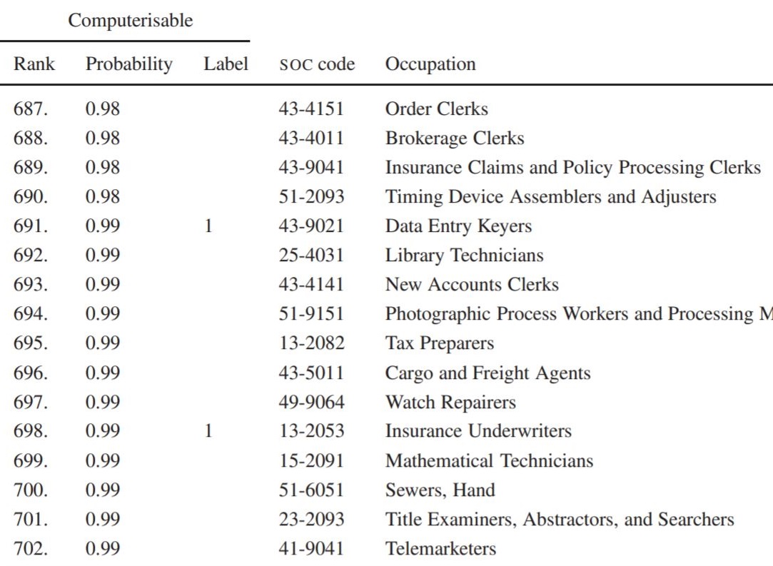 The table below is from the list. It ranks occupations according to their probability of computerization.