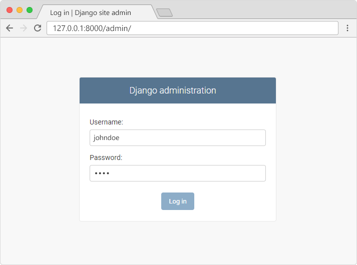 In the browser window, type 127.0.0.1:8000/admin in the address bar.