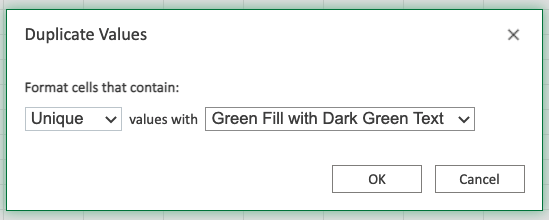 The "Duplicate Values..." Highlight Cell Rule will highlight a cell with one of the appearance options based on the cell value being the same as other cells in the range.