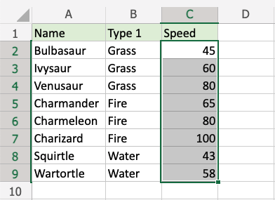 Charizard has the highest Speed value (100) and Squirtle has the lowest Speed value (43).