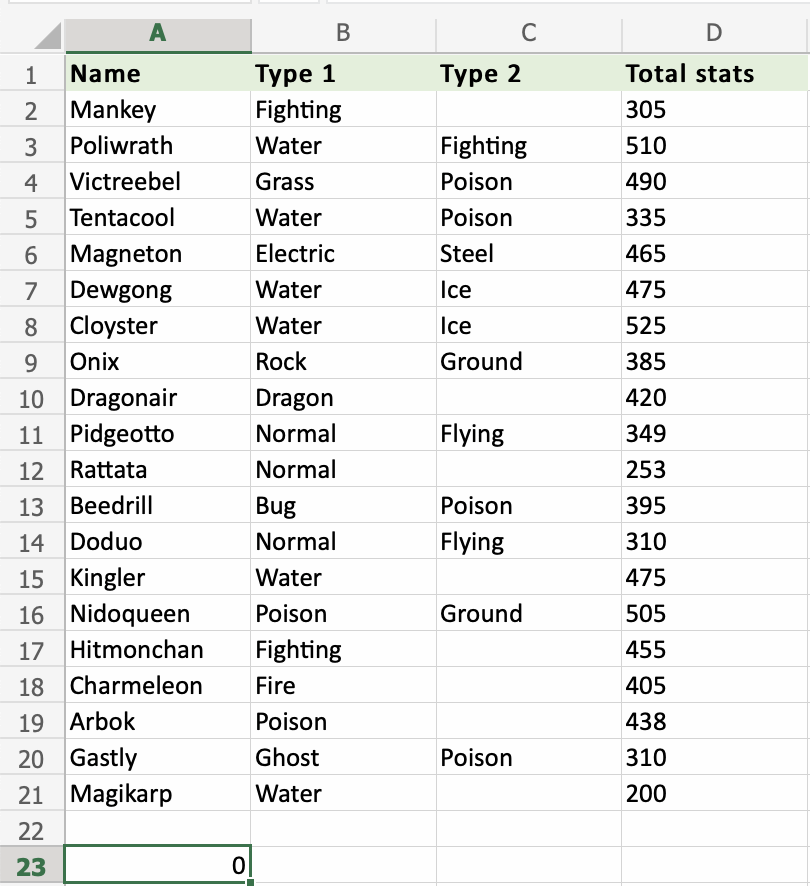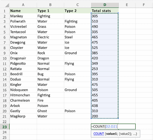 Apply the =COUNT function to range D2:D21. Counting the cells of Pokemon Total stats, which is numbers only: