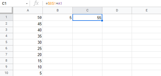 Great! You have successfully used absolute reference to add B1(5) with the range A1:A10.