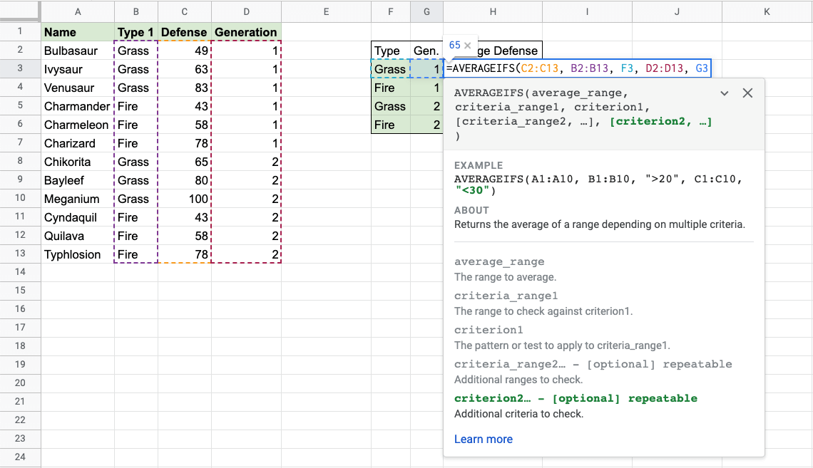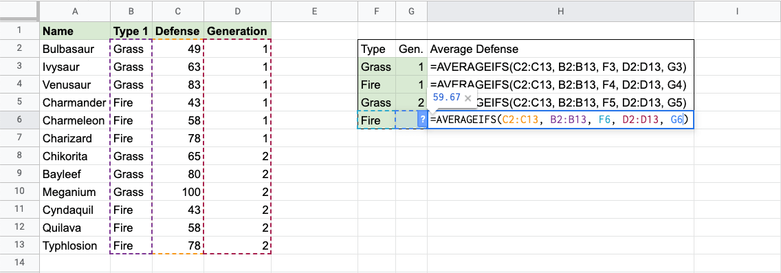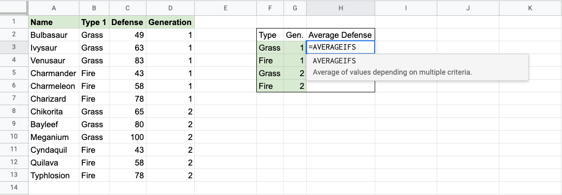 The function now calculates the average defense value of the 1st Generation Grass type Pokemon: Bulbasaur, Ivysaur and Venusaur.