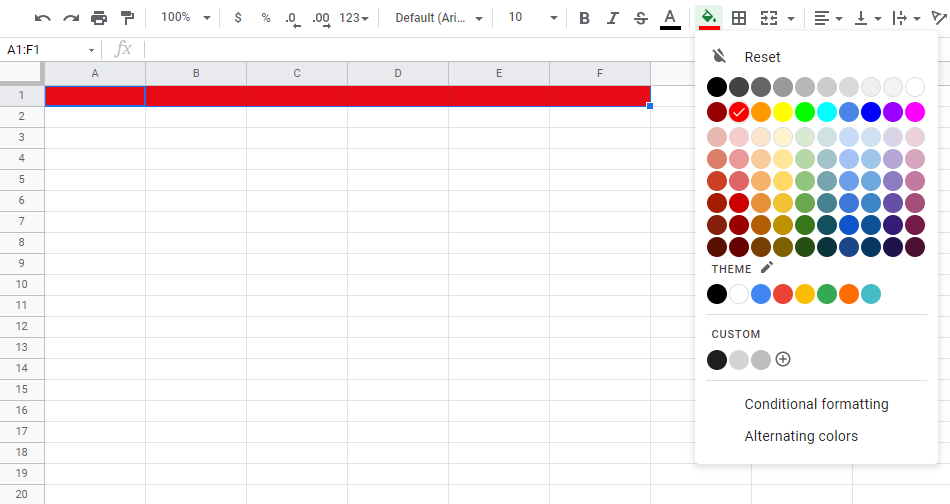 Google Sheets has a set of standard, theme and custom colors available for use. You select a color by clicking on it: