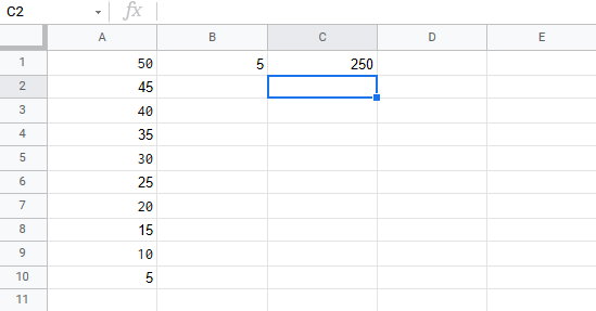 You got it! You have successfully used absolute reference to multiply B1(5) with the range A1:A10.